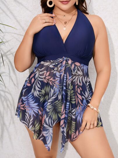 SHEIN Swim Curve Vestido de playa de talla grande con estampado tropical y bajo asimétrico para el verano - Multicolor - Añade 1