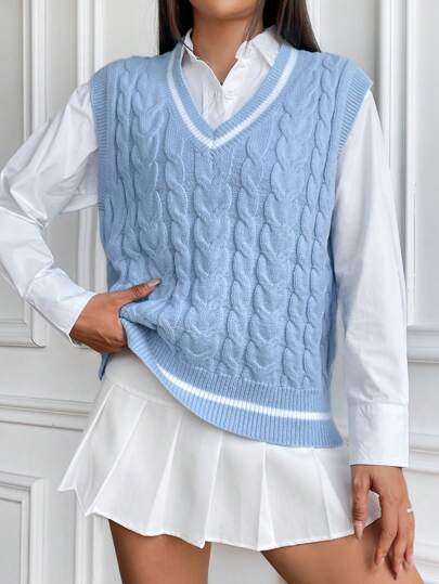 SHEIN Qutie 1 pieza Chaleco de punto ribete de rayas tejido de cable - Azul y blanco - Añade 6
