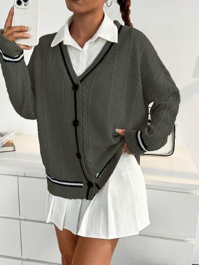 SHEIN Qutie Cárdigan casual sencillo de manga larga con botones delanteros, de estilo a rayas y patchwork, ropa para profesores - Multicolor - Añade 1