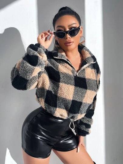 SHEIN SXY Pullover teddy con patrón de cuadros de hombros caídos - Multicolor - Añade 1