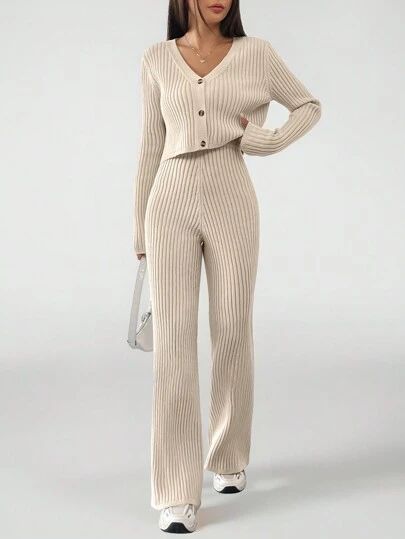 SHEIN Tall Cardigan de punto acanalado color caqui y pantalón de punto - Albaricoque - Añade 1