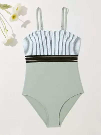 SHEIN Chicas adolescentes Bañador una pieza con estampado de rayas de malla en contraste - verde menta - Añade 5