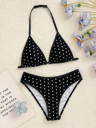 SHEIN Conjunto de bikini con tirantes de espagueti con estampado floral vintage para adolescentes, conjunto de bikini de triángulo con textura de punto de color albaricoque, decoración de concha de cuello halter para traje de baño de playa de verano