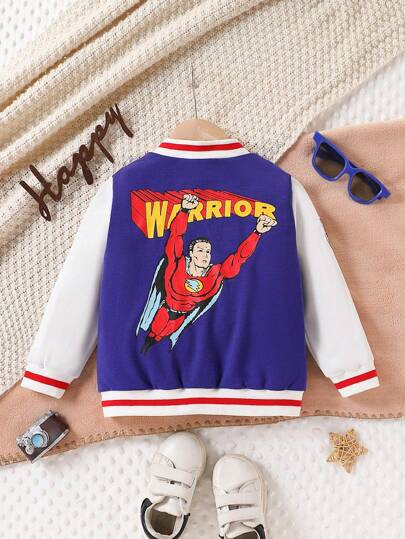 SHEIN Chaqueta con cuello alto, de punto grueso y acogedor, personalizada con cremallera para niños. Incluye puños y bajo con ribete de punto, estampado de dibujos animados en la espalda y diseño de manga de color contrastante. Multifuncional, apropiada para primavera, otoño, invierno y salas con aire acondicionado. - Multicolor - Añade 7