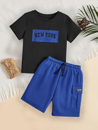 SHEIN Niñito con estampado de letra Camiseta & con bolsillo con solapa Shorts - Azul - Añade 1