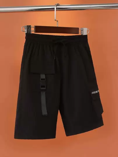 SHEIN Chicos Shorts con estampado de letra con diseño con hebilla con bolsillo con solapa de cintura con cordón cargo - Negro - Añade 1