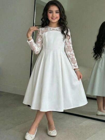 SHEIN Vestido de manga larga de unicolor con cuello redondo, gran lazo decorativo, bordado de flores 3D y parches de malla, estilo elegante de princesa para niña preadolescente, color blanco, adecuado para boda, niña de las flores, fiesta - Blanco - Añade 1