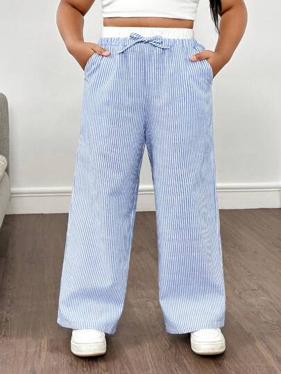 SHEIN Pantalones anchos de pierna ancha de raya con cinturilla de contraste de tiro medio casual suelto para niñas preadolescentes de talla extendida - Azul - Añade 1
