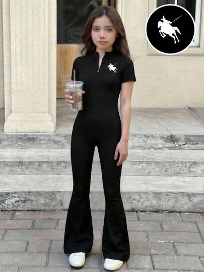 SHEIN Mono de una pieza con cremallera hasta la mitad para niñas preadolescentes, mono negro con pierna acampanada, para volver al colegio o salidas de ocio - Negro - Añade 1