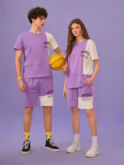Manfinity 1 pieza Camiseta con estampado de letra de color combinado & 1 pieza Shorts - Morado - Añade 2