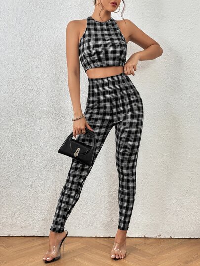 SHEIN Privé con estampado de cuadros Top tank crop & Leggings - Blanco y Negro - Añade 2
