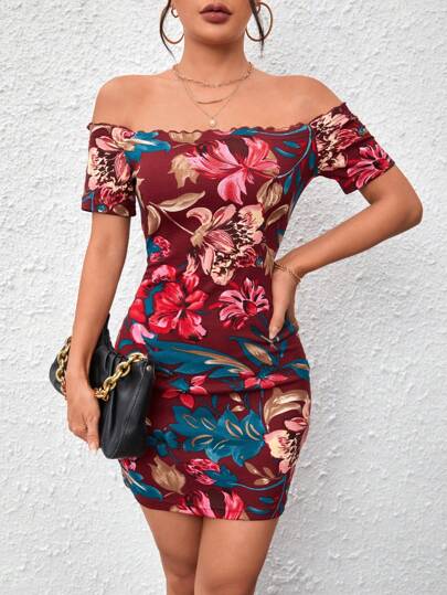 SHEIN Privé Vestido ajustado con estampado floral de hombros descubiertos - Burdeos - Añade 1