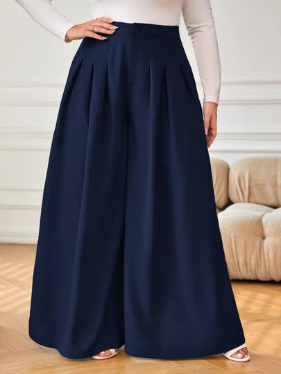 SHEIN Privé Pantalones de pierna ancha de talle alto con fruncido - Azul Marino - Añade 2