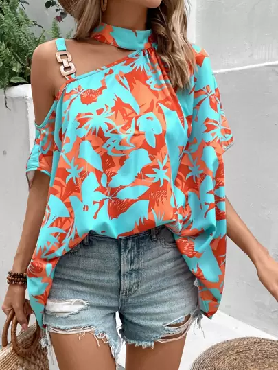Breezaya Blusa con estampado floral de cuello asimétrico con diseño de cadena - Azul menta - Añade 1