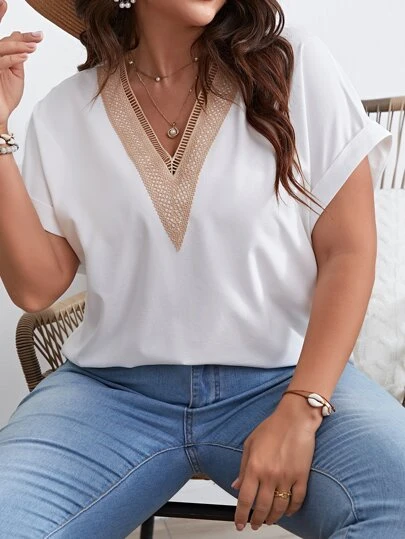 SHEIN LUNE Blusa con encaje en contraste de manga murciélago - Blanco - Añade 2