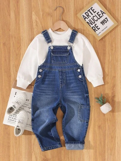 SHEIN Vintaside Kids Pantalones de peto de diseño de bolsillo casual y cómodos de moda para niño pequeño - Azul lavado medio - Añade 1