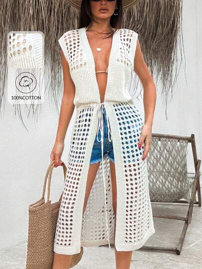 EURMUSE Suéter de mujer de unicolor con diseño de abertura delantera y cordón - Beis - Añade 7