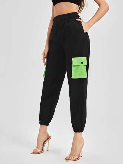 Felicity Pantalones cargo con bolsillo con solapa y bloques de color de diseñador - Negro - Añade 1