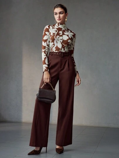 MOTF PREMIUM Pantalones de traje rectos con costuras frontales y hebilla sólida - Burdeos - Añade 5