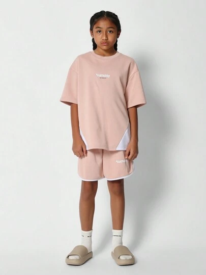 SUMWON Conjunto de 2 piezas de camiseta holgada con bloques de color y pantalón corto, unisex para niños - Rosa - Añade 1
