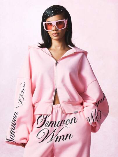SUMWON WOMEN Sudadera corta cremallera completa de lujo con bordado de letras, prenda de declaración de moda urbana, ropa informal deportiva oversize, esencial para otoño e invierno - Rosa - Añade 7