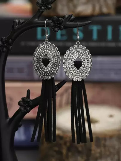 Pendientes largos ribete en abanico oval & con fleco - Plata antigua - Añade 5