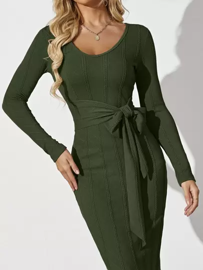 Chiquease Vestido ajustado con cordón delantero de cuello redondo - Verde militar - Añade 5