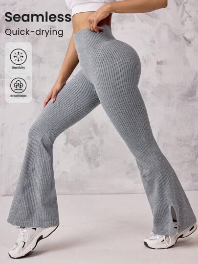 Easithlete Pantalones de yoga para mujer sin costuras con abertura lateral y pierna acampanada - Gris - Añade 3
