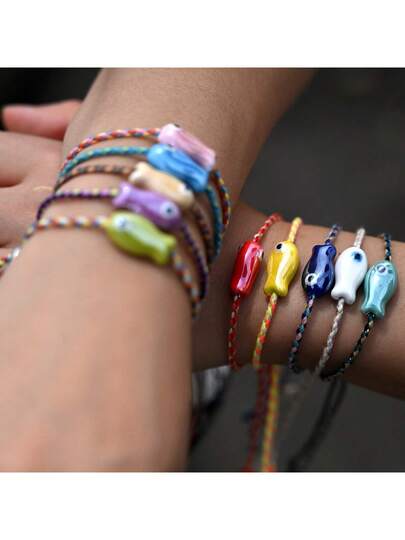 Juego de 10 piezas de brazaletes de cerámica con forma de pez para mujeres, hechos a mano con cuerda de colores tejida, estilo bohemio, brazalete de encanto, joyería de amistad popular - Multicolor - Añade 1