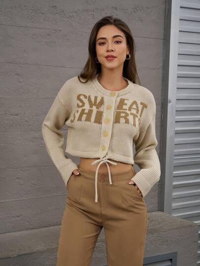 Cardigan de punto con corbata en el frente y borde de jacquard corto - Albaricoque - Añade 6