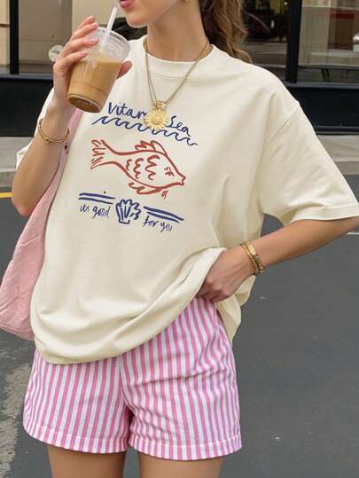 Camiseta de manga corta de corte holgado con estampado de escamas de pez minimalista para mujeres de talla grande, adecuada para el verano, el Año Nuevo Chino, el Año Nuevo Lunar, el Año del Caballo, el Festival de Primavera, Feliz Año Nuevo, San Valentín - Albaricoque - Añade 1