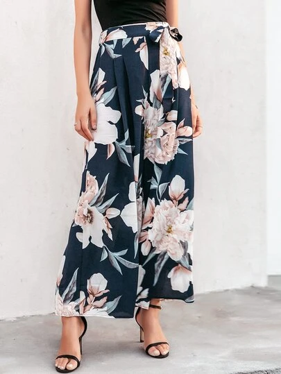 Simplee pantalones anchos floral con cinturón de cintura alta - Azul Marino - Añade 6
