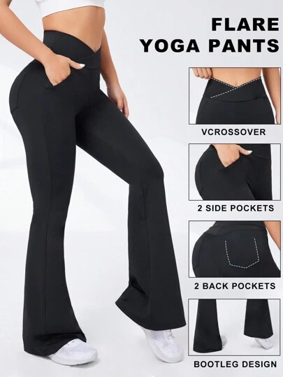 Daily&Casual Pantalones Deportivos Acampanados Con Bolsillo Inclinado Y Cintura En Forma De V - Negro - Añade 5