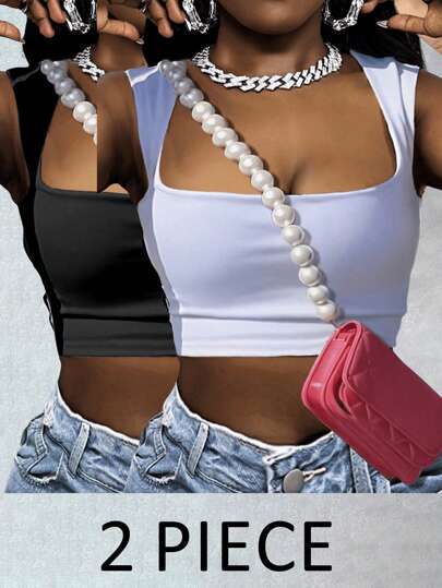 Slaydiva Set de 2 piezas Conjunto de top corto sin mangas de cuello cuadrado y ajustado, informal para verano - Multicolor - Añade 2