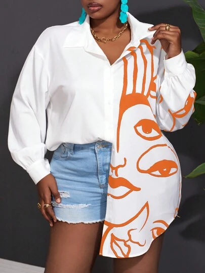 Slaydiva Blusa informal con estampado de líneas gráficas y rostros para mujer talla grande - Naranja - Añade 1