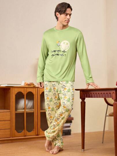 Conjunto de pijama para hombre con top de cuello redondo de manga larga con estampado de cara sonriente y letras, y pantalones - Verde - Añade 5
