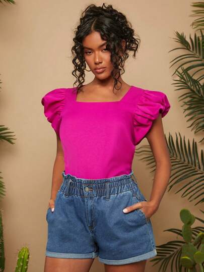 Travachic Camisa de manga corta holgada y de ajuste regular con escote cuadrado en unicolor para mujeres, estilo vacacional - Rosa Fucsia - Añade 3