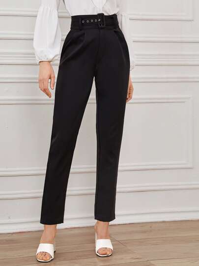 SHEIN Clasi Pantalones entallados con hebilla de ojal - Negro - Añade 2