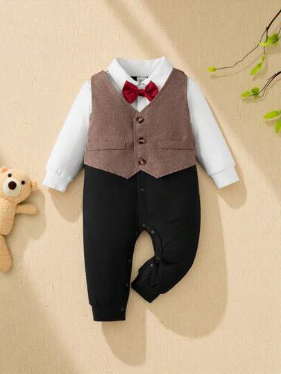 Souflis Souflis Pelele de manga larga con cuello, estilo chaleco, con bloqueo de color en contraste, bolsillos falsos y decoración de moño para bebé niño, para primavera/otoño - Multicolor - Añade 1