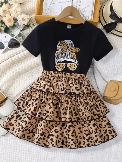Sparklyn Conjunto informal de 2 piezas para niña preadolescente con blusa de cuello redondo de manga corta con estampado de leopardo y falda con cintura elástica y volantes en el bajo, para verano - Multicolor - Añade 4
