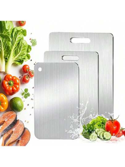 Tabla de cortar de acero inoxidable de doble cara, a prueba de óxido, duradera, muy adecuada para carne, frutas y verduras - Esterilla de cortar de cocina de alta gama con mayor higiene - Plateado - Añade 3
