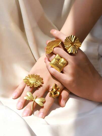 Anillos de textura metálica de acero inoxidable para mujeres y niñas, con diseño exagerado de flores y girasoles, regalos de joyería para fiestas y el Día de los Enamorados 2024 - Amarillo Oro - Añade 4