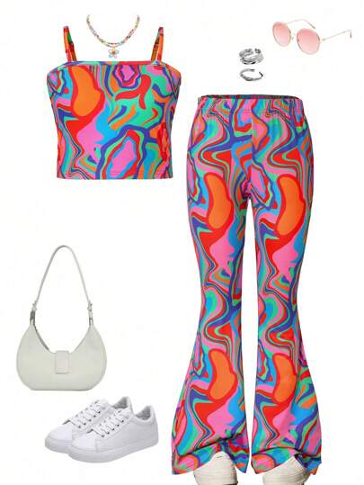 SHEIN Conjunto de top tipo camiseta con estampado ondulado colorido + pantalones acampanados para niña preadolescente, look casual y versátil para vacaciones - Multicolor - Añade 1