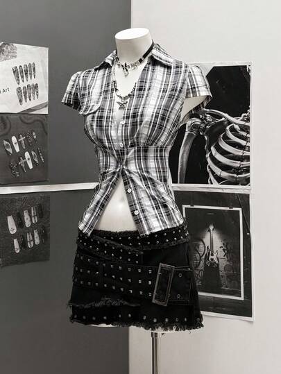 StreetHx Camisa ajustada con mangas cortas y estampado de cuadros azules para mujer - Negro - Añade 1