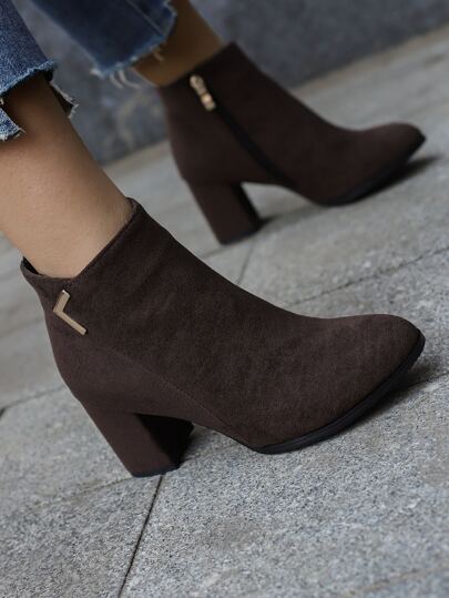 Botas clásicas sintética con diseño metal de punta con cremallera lateral con tacón grueso - Marrón Chocolate - Añade 1