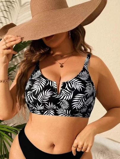 SHEIN Swim Curve Top bikini con estampado de planta de cuello notch push up - Negro - Añade 3