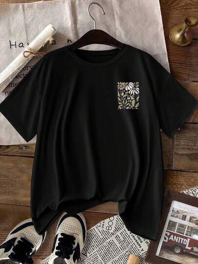 INAWLY Camiseta De Verano Casual Con Estampado Floral, Hombro Caído Y Manga Corta - Negro - Añade 1