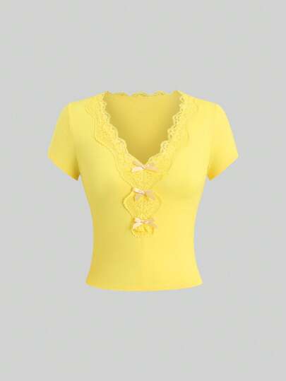 SHEIN Unity Camiseta de verano elegante con encaje de parches y decoración de lazo - Amarillo - Añade 5