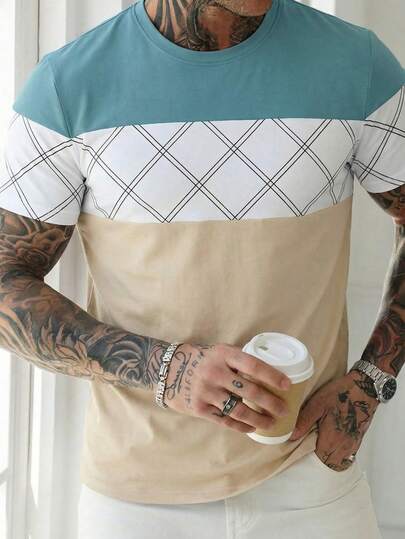 Nueva camiseta de verano para hombre con bloques de color y rayas de manga corta, adecuada para el uso de verano, cómoda y transpirable, de moda líder - Azul y blanco - Añade 1