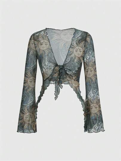 ROMWE PUNK Top con estampado de sol y luna con cordón delantero ribete en forma de lechuga de malla - Multicolor - Añade 1
